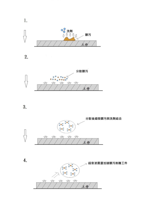 利用清洗過程中,工件表面產生大量的氫氣,使髒污快速從工件表面分散,並與洗劑結合,同時利用超聲波的空化效應,使產生無數小氣泡與工件進行互相撞擊加快髒污剝離工件達到洗淨的目的。